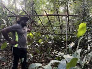 One of the types of data collected during our study period relates to the climate. We monitor a pluviometer twice a day, a thermohygrometer once a day, and soil moisture data is recorded continuously. The pluviometer is placed at camp where there is sufficient open space, while the other sensors are installed deeper in the forest to better represent its microclimate. To protect the instruments, a small shed was built about 300 meters from camp, carefully maintaining the surrounding vegetation to ensure the readings remain as accurate and undisturbed as possible.