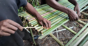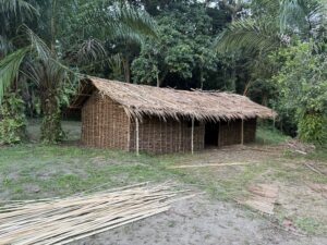 To prepare for the work ahead, we first needed to find a suitable place to store our materials and samples. One of the newly constructed houses offers two rooms, one of which we quickly christened our new depot. Since we are within Salonga National Park, a UNESCO World Heritage Site, all the structures built at camp are made entirely from natural materials. In this case, Marantaceae stems (Haumania liebrechtsiana) and mud form the core of the buildings. The Marantaceae family dominates the rainforest understory in this region and serves many purposes, from food packaging to construction. The stems are bound together with lianas (Eremospatha haullevilleana) to create the house frames, which are then coated with mud for stability. Finally, the roofs are thatched with dried Raphia laurentii leaves, a simple yet effective shelter against the rain – our camp’s ever-faithful visitor.
